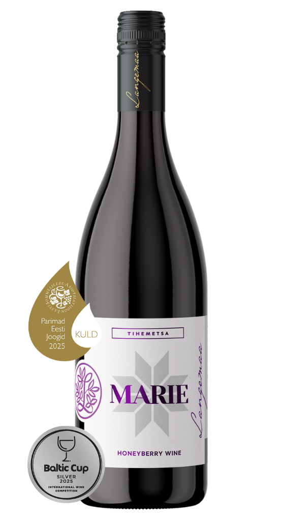 Langemaa MARIE on tummanpunainen, violetinsävyinen puolikuiva viini, jonka tunnusomaisia piirteitä ovat tasapainoinen marjaisuus ja pehmeä tanniinisuus.